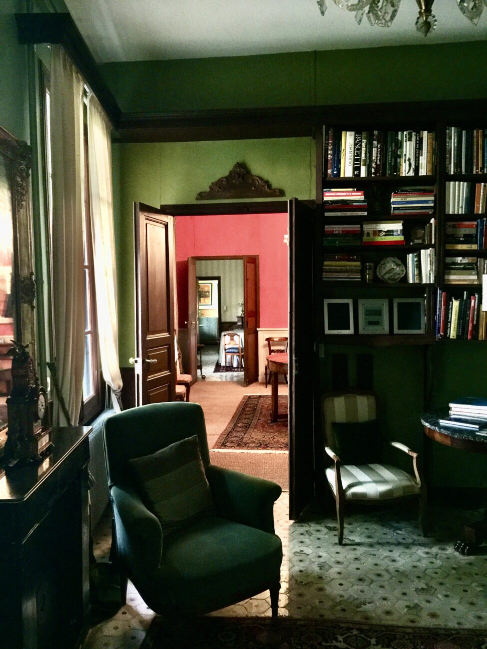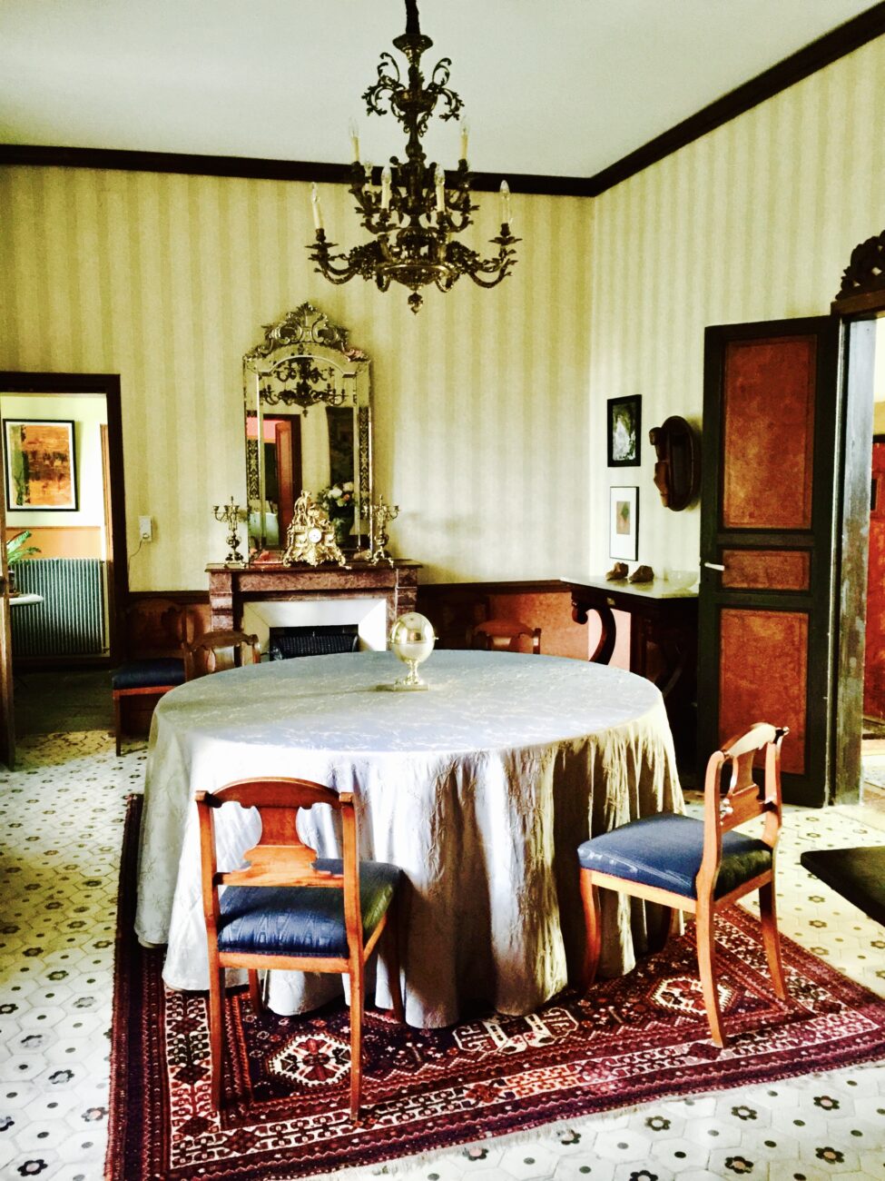 La maison est composée au RdC, d'un grand hall d'entrée, d'un salon, d'une salle à manger, d'une bibliothèque, d'une cuisine, d'un bureau, d'une lingerie, ainsi que d'une chambre avec salle d'eau et toilettes.